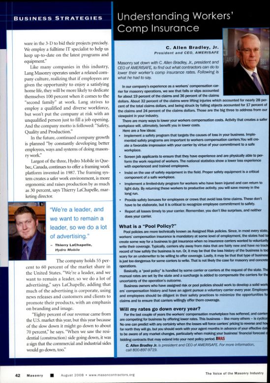 Masonry sat down with C. Allen Bradley, Jr., president and CEO of AMERISAFE, to find out what contractors can do to lower their worker's comp insurance rates. Following is what he had to say.
