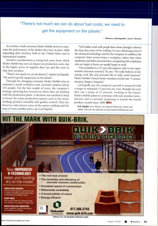 LaChapelle says the company's growth is measured with a target to maintain 15 percent per year, though last year they saw a jump of 25 percent. Looking to the future, Hydro Mobile plans to continue with new product introduction and is currently preparing to launch the fourth product created since 2000. IMAS