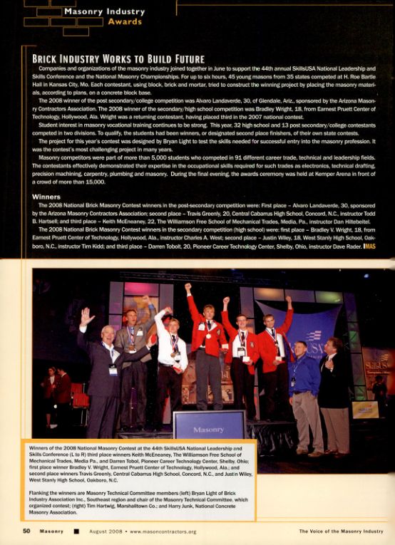 The 2008 winner of the post secondary/college competition was Alvaro Landaverde, 30, of Glendale, Ariz., sponsored by the Arizona Masonry Contractors Association. The 2008 winner of the secondary/high school competition was Bradley Wright, 18, from Earnest Pruett Center of Technology, Hollywood, Ala. Wright was a returning contestant, having placed third in the 2007 national contest.