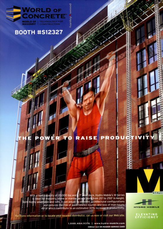 With a load capacity of 20,000 lbs and a 7' wide deck, Hydro Mobile's M-Series is ideal for masonry, stone or marble facade work from 20 to 250' in height. Both highly adaptable and safe, it can adjust to different architectural configurations and reduces the risk of work-related injuries and loss of man-hours. All of which contribute to an estimated 30% increase in productivity.