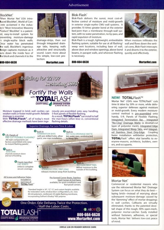Mortar Net USA's new TOTALFlash cuts time & labor by 50% or more, while delivering superior defenses against moisture or mold-growth. Every modern moisture-control method is pre-assembled onto handy, 5-ft. Panels of Flexible Flashing. Integrated Termination Bar, Integrated "No-Clog" Drainage Matte (a dovetail-cut layer of polyester mesh). Integrated Edge Dam, Integrated Weep Tabs, and Integrated Stainless Steel Drip-Edge. Coupling faster installation withbetter protection, TOTAL Flash offers vital benefits to everyone-masons, architects, builders, owners, and occupants.