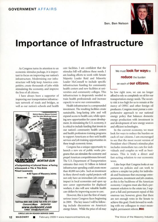 I have always been a supporter of improving our transportation infrastructure network of roads and bridges, as well as our nation's schools and health care facilities. I am confident that the stimulus bill will address these needs. I am leading efforts to work with Senate Majority Leader Reid and Minority Leader McConnell to include specific infrastructure funding for community health centers and new facilities at universities and community colleges. This infrastructure is desperately needed to train health professionals and increase capacity to serve our communities.