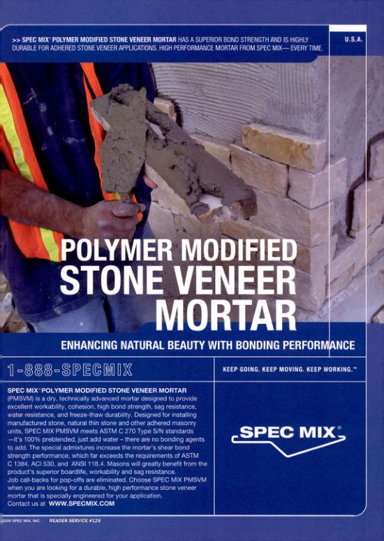 SPEC MIX® POLYMER MODIFIED STONE VENEER MORTAR (PMSVM) is a dry, technically advanced mortar designed to provide excellent workability, cohesion, high bond strength, sag resistance, water resistance, and freeze-thaw durability. Designed for installing manufactured stone, natural thin stone and other adhered masonry units, SPEC MIX PMSVM meets ASTM C 270 Type S/N standards - it's 100% preblended, just add water - there are no bonding agents to add. The special admixtures increase the mortar's shear bond strength performance, which far exceeds the requirements of ASTM C 1384, ACI 530, and ANSI 118.4. Masons will greatly benefit from the product's superior boardlife, workability and sag resistance. Job call-backs for pop-offs are eliminated. Choose SPEC MIX PMSVM when you are looking for a durable, high performance stone veneer mortar that is specially engineered for your application. Contact us at WWW.SPECMIX.COM
