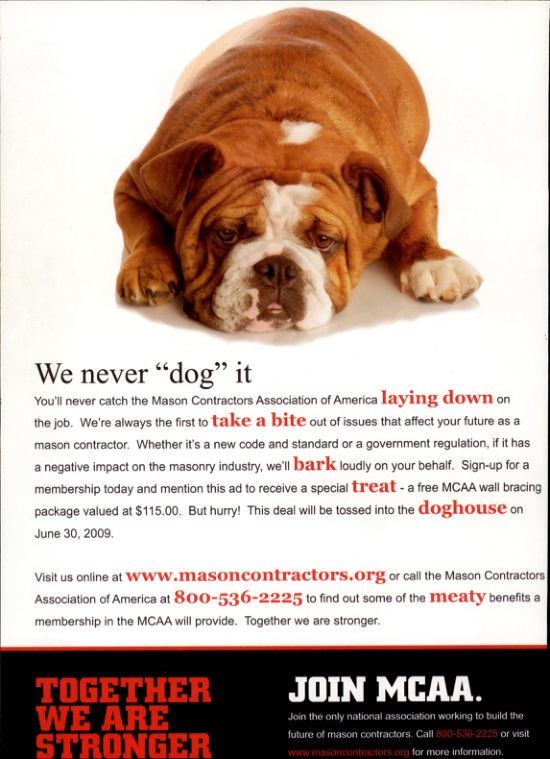 You'll never catch the Mason Contractors Association of America laying down on the job. We're always the first to take a bite out of issues that affect your future as a mason contractor. Whether it's a new code and standard or a government regulation, if it has a negative impact on the masonry industry, we'll bark loudly on your behalf. Sign-up for a membership today and mention this ad to receive a special treat - a free MCAA wall bracing package valued at $115.00. But hurry! This deal will be tossed into the doghouse on June 30, 2009.