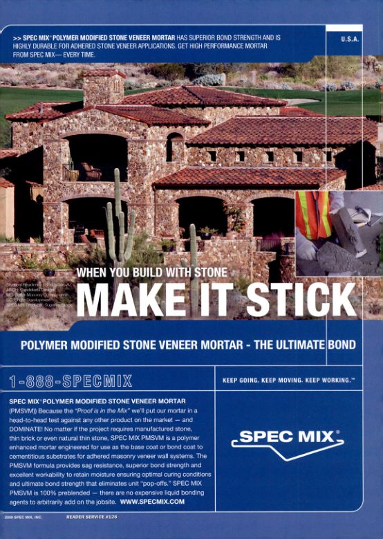 (PMSVM)) Because the "Proof is in the Mix" we'll put our mortar in a head-to-head test against any other product on the market - and DOMINATE! No matter if the project requires manufactured stone, thin brick or even natural thin stone, SPEC MIX PMSVM is a polymer enhanced mortar engineered for use as the base coat or bond coat to cementitious substrates for adhered masonry veneer wall systems. The PMSVM formula provides sag resistance, superior bond strength and excellent workability to retain moisture ensuring optimal curing conditions and ultimate bond strength that eliminates unit "pop-offs." SPEC MIX PMSVM is 100% preblended there are no expensive liquid bonding agents to arbitrarily add on the jobsite. WWW.SPECMIX.COM 2009 SPEC MIX, INC. READER SERVICE #126