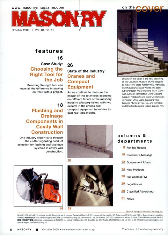 Shown on the cover is the new East Wing of the Cleveland Museum of Art, designed by New York-based Rafael Viñoly Architects, and Philadelphia-based Vitetta. The stone subcontractor was Scotstone Inc. in Cleveland. General contractors were Graciano Corp in Pittsburgh, and Jance Construction in Mentor, Ohio. Stone Suppliers were Georgia Marble in Tate, Ga.. and Johnston and Rhodes Bluestone in East Branch, N.Y.