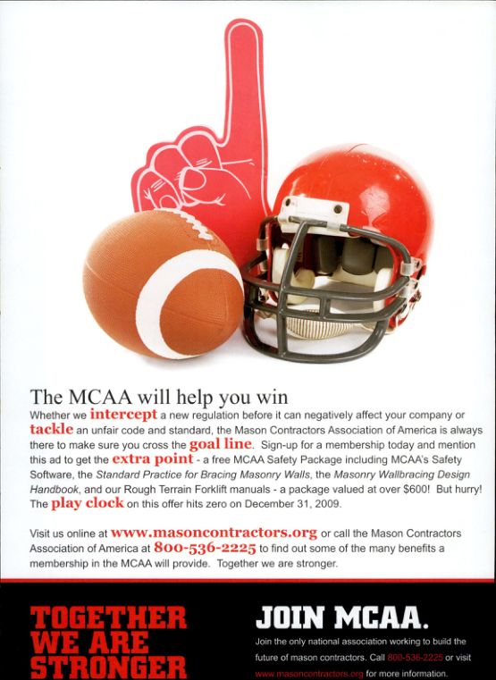 Whether we intercept a new regulation before it can negatively affect your company or tackle an unfair code and standard, the Mason Contractors Association of America is always there to make sure you cross the goal line. Sign-up for a membership today and mention this ad to get the extra point - a free MCAA Safety Package including MCAA's Safety Software, the Standard Practice for Bracing Masonry Walls, the Masonry Wallbracing Design Handbook, and our Rough Terrain Forklift manuals - a package valued at over $600! But hurry! The play clock on this offer hits zero on December 31, 2009.