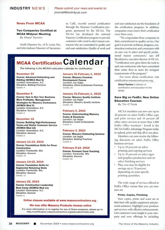 Smith Masonry Inc. of St. Louis, Mo., and John Jackson Masonry of Sacramento, Calif., recently earned certification through the Masonry Certification program, sponsored by the MCAA. The MCAA has developed the national Masonry Certification program to provide customers with a tool to select mason contractors who are committed to quality and end-user satisfaction. Quality of work and end-user satisfaction are the foundation of the certification program. In addition, companies must renew their certification every three years.