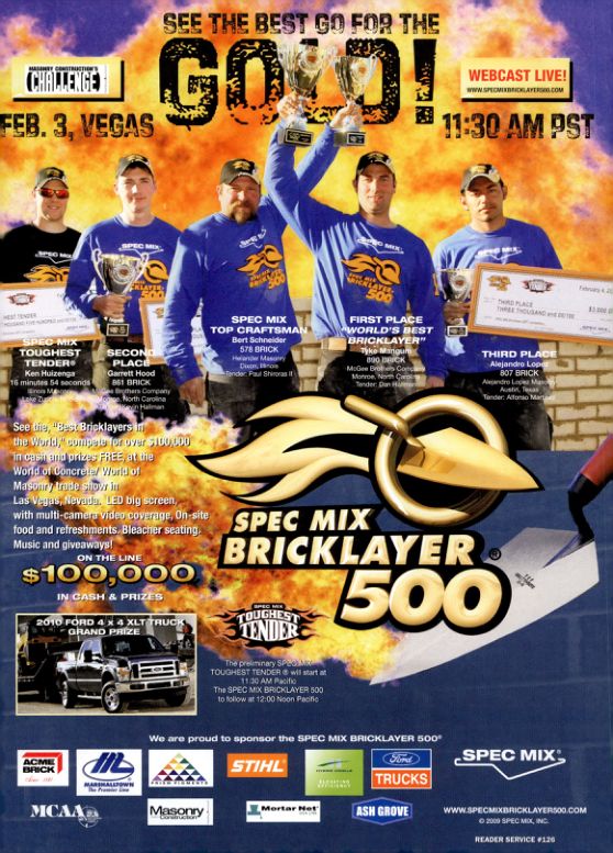 ACME BRICK MCAA We are proud to sponsor the SPEC MIX BRICKLAYER 500° JIL STIHL Ford TRUCKS Masonry Mortar Not ASH GROVE SPEC MIX WWW.SPECMIXBRICKLAYER500.COM © 2009 SPEC MIX, INC. READER SERVICE #126 $3.000.0