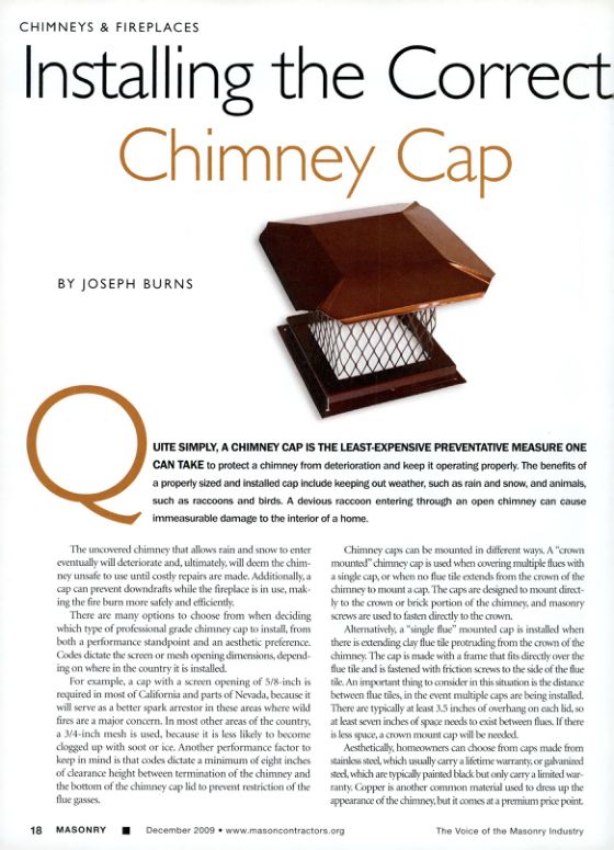There are many options to choose from when deciding which type of professional grade chimney cap to install, from both a performance standpoint and an aesthetic preference. Codes dictate the screen or mesh opening dimensions, depending on where in the country it is installed.