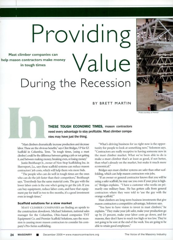 MAST CLIMBER COMPANIES are finding an upside to the construction slowdown. Michael Solomon, national sales manager for the Columbus, Ohio-based companies TNT Equipment Co. and Premier Scaffold Solutions, says the recession is causing more mason contractors to consider his company's Pro-Series scaffolding.