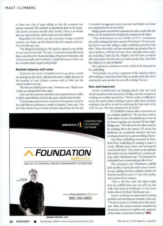 ALTHOUGH MAST CLIMBER SALES are down, rentals are picking up the slack. Solomon has seen a slight decrease in the number of mast climber systems sold in 2009, but the rental market is strong.