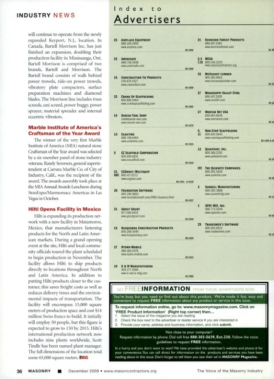 To request information online, go to: www.masonrymagazine.com. Click on 'FREE Product Information (Right top corner) then...