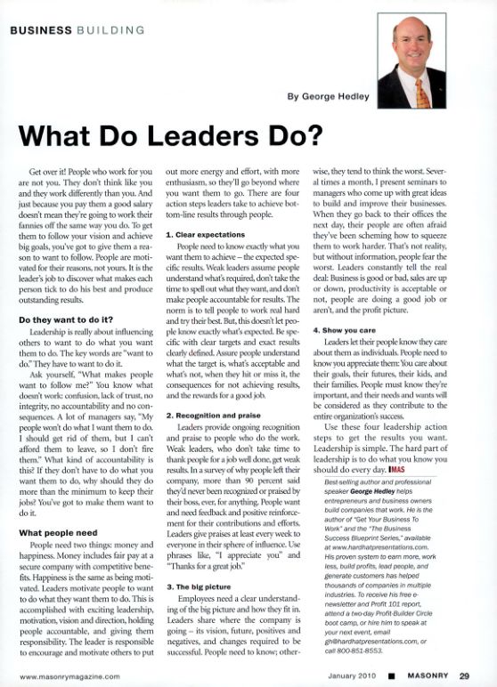Best selling author and professional speaker George Hedley helps entrepreneurs and business owners build companies that work. He is the author of "Get Your Business To Work" and the "The Business Success Blueprint Series," available at www.hardhatpresentations.com. His proven system to earn more, work less, build profits, lead people, and generate customers has helped thousands of companies in multiple industries. To receive his free e-newsletter and Profit 101 report, attend a two-day Profit-Builder Circle boot camp, or hire him to speak at your next event, email gh@hardhatpresentations.com, or call 800-851-8553