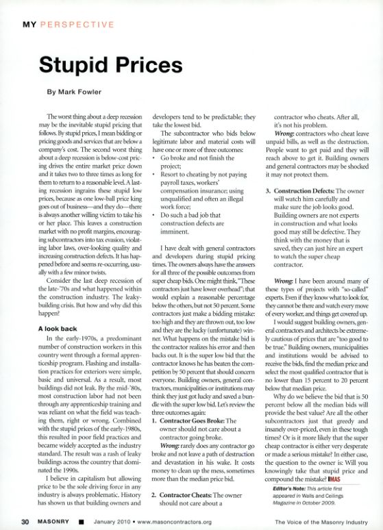 The worst thing about a deep recession may be the inevitable stupid pricing that follows. By stupid prices, I mean bidding or pricing goods and services that are below a company's cost. The second worst thing about a deep recession is below-cost pricing drives the entire market price down, and it takes two to three times as long for them to return to a reasonable level. A lasting recession ingrains these stupid low prices, because as one low-ball price king goes out of business—and they do—there is always another willing victim to take his or her place. This leaves a construction market with no profit margins, encouraging subcontractors into tax evasion, violating labor laws, overlooking quality, and increasing construction defects. It has happened before and seems re-occurring, usually with a few minor twists.