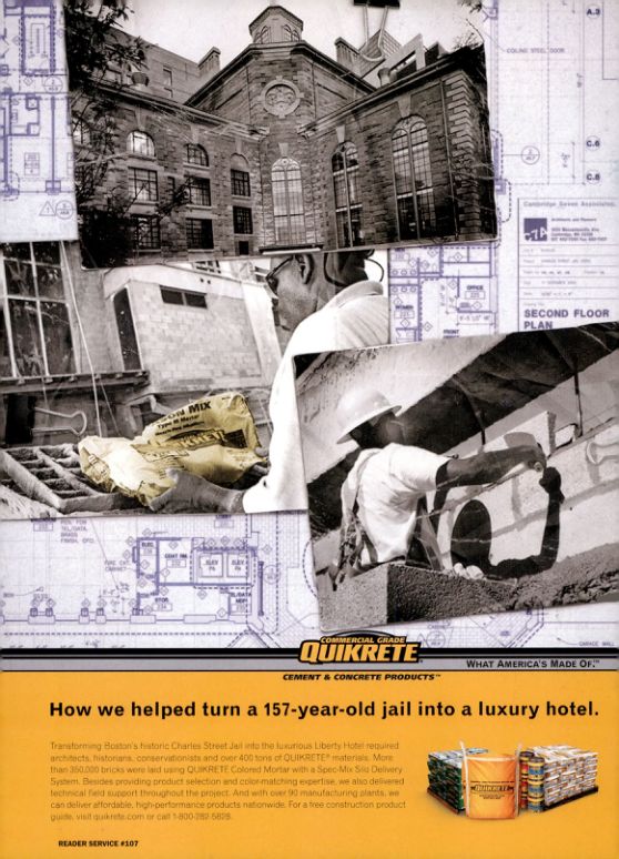 Transforming Boston's historic Charles Street Jail into the luxurious Liberty Hotel required architects, historians, conservationists and over 400 tons of QUIKRETE materials. More than 350,000 bricks were laid using QUIKRETE Colored Mortar with a Spec-Mix Silo Delivery System. Besides providing product selection and color-matching expertise, we also delivered technical field support throughout the project. And with over 90 manufacturing plants, we can deliver affordable, high-performance products nationwide. For a free construction product guide, visit quikrete.com or call 1-800-282-5828