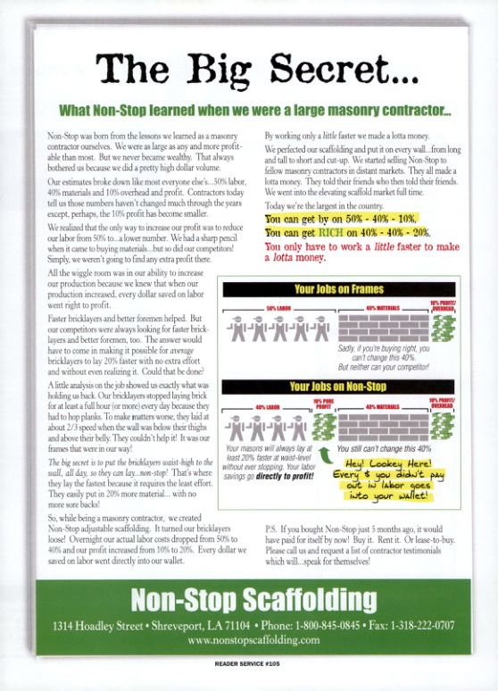 By working only a little faster we made a lotta money. We perfected our scaffolding and put it on every wall...from long and tall to short and cut-up. We started selling Non-Stop to fellow masonry contractors in distant markets. They all made a lotta money. They told their friends who then told their friends. We went into the elevating scaffold market full time. Today we're the largest in the country.