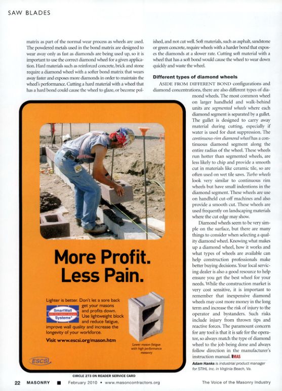 Diamond wheels seem to be very simple on the surface, but there are many things to consider when selecting a quality diamond wheel. Knowing what makes up a diamond wheel, how it works and what types of wheels are available can help construction professionals make better buying decisions. Your local servicing dealer is also a good resource to help ensure you get the best wheel for your needs. While the construction market is very cost sensitive, it is important to remember that inexpensive diamond wheels may cost more money in the long term and increase the risk of injury to the operator and bystanders. Such risks include injury from thrown tips and reactive forces. The paramount concern for any tool is that it is safe for the operator, so always match the type of diamond wheel to the job being done and always follow direction in the manufacturer's instruction manual. IMAS