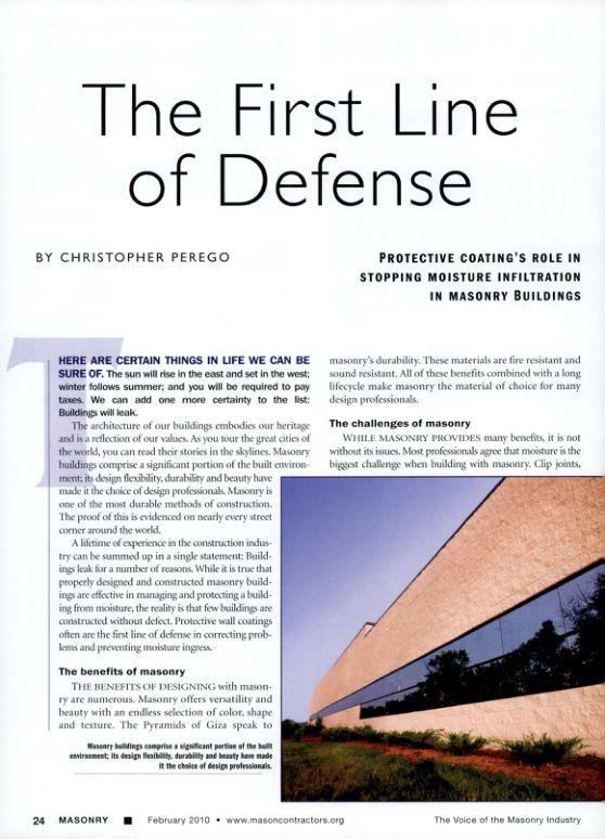 A lifetime of experience in the construction industry can be summed up in a single statement: Buildings leak for a number of reasons. While it is true that properly designed and constructed masonry buildings are effective in managing and protecting a building from moisture, the reality is that few buildings are constructed without defect. Protective wall coatings often are the first line of defense in correcting problems and preventing moisture ingress.