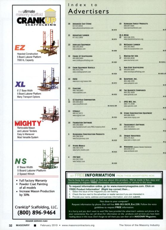 In a hurry, and you don't want to wait! We have provided the advertiser's website and phone for your convenience. You can call direct for information on the products and services you have been reading about in this issue. Don't forget to tell them you saw their ad in MASONRY Magazine.