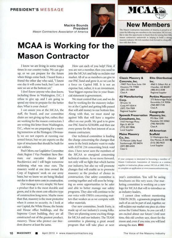 I can assure you at the MCAA, the staff, the board, and our committee chairs are not giving up but, rather, they are working for the mason contractors. I am writing this letter from Washington, D.C., where we are preparing for a meeting tomorrow at the Pentagon. Obviously, we are not experts at running our armed forces, but we are experts on the type of structures that should be built for our soldiers.
