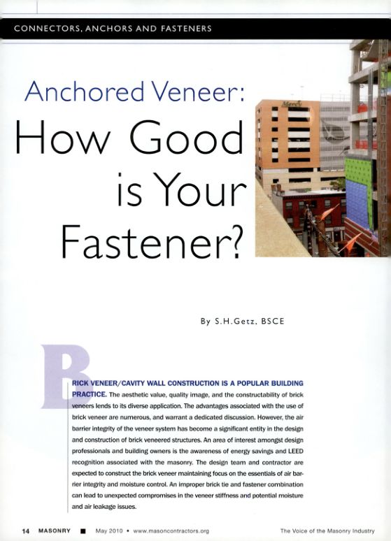 RICK VENEER/CAVITY WALL CONSTRUCTION IS A POPULAR BUILDING PRACTICE. The aesthetic value, quality image, and the constructability of brick veneers lends to its diverse application. The advantages associated with the use of brick veneer are numerous, and warrant a dedicated discussion. However, the air barrier integrity of the veneer system has become a significant entity in the design and construction of brick veneered structures. An area of interest amongst design professionals and building owners is the awareness of energy savings and LEED recognition associated with the masonry. The design team and contractor are expected to construct the brick veneer maintaining focus on the essentials of air barrier integrity and moisture control. An improper brick tie and fastener combination can lead to unexpected compromises in the veneer stiffness and potential moisture and air leakage issues.