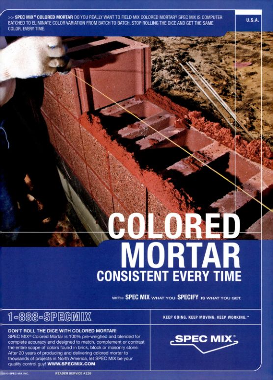 DON'T ROLL THE DICE WITH COLORED MORTAR! SPEC MIX® Colored Mortar is 100% pre-weighed and blended for complete accuracy and designed to match, complement or contrast the entire scope of colors found in brick, block or masonry stone. After 20 years of producing and delivering colored mortar to thousands of projects in North America, let SPEC MIX be your quality control guy! WWW.SPECMIX.COM