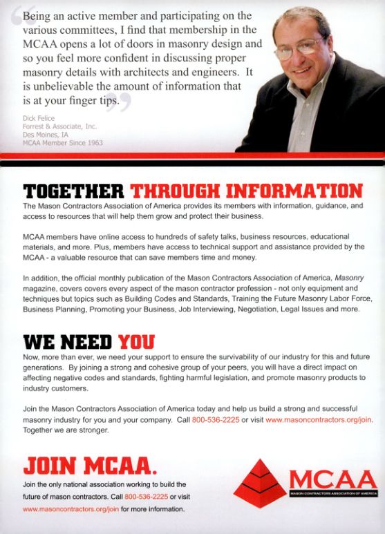Join the Mason Contractors Association of America today and help us build a strong and successful masonry industry for you and your company. Call 800-536-2225 or visit www.masoncontractors.org/join. Together we are stronger.