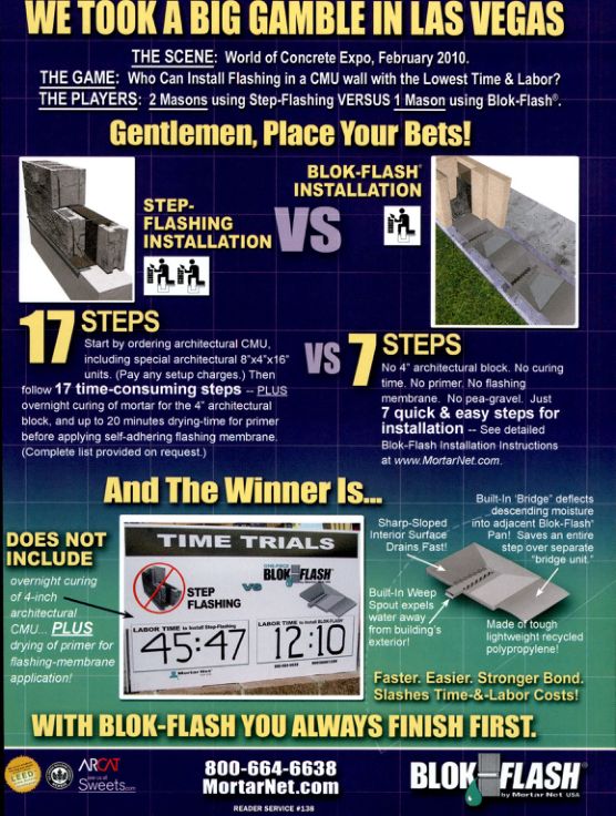 No 4" architectural block. No curing time. No primer. No flashing membrane. No pea-gravel. Just 7 quick & easy steps for installation -- See detailed Blok-Flash Installation Instructions at www.MortarNet.com.