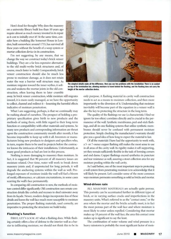Here's food for thought: Why does the masonry on a university library built less than 10 years ago require almost as much money invested in its repair as it cost to initially erect it? At the same time, consider how a building like Somerset House in London, built somewhere around 1755, has survived all these years without the benefit of a weep system or mortar collection device in its construction.