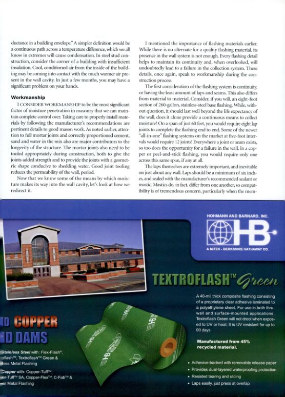 The first consideration of the flashing system is continuity, or having the least amount of laps and seams. This also differs from material to material. Consider, if you will, an eight-foot section of 260-gallon, stainless-steel base flashing, While, without question, it should last well beyond the life expectancy of the wall, does it alone provide a continuous means to collect moisture? On a span of just 60 feet, you would require eight lap joints to complete the flashing end to end. Some of the newer "all-in-one" flashing systems on the market at five-foot intervals would require 12 joints! Everywhere a joint or seam exists, so too does the opportunity for a failure in the wall. In a copper or peel-and-stick flashing, you would require only one across this same span, if any at all.