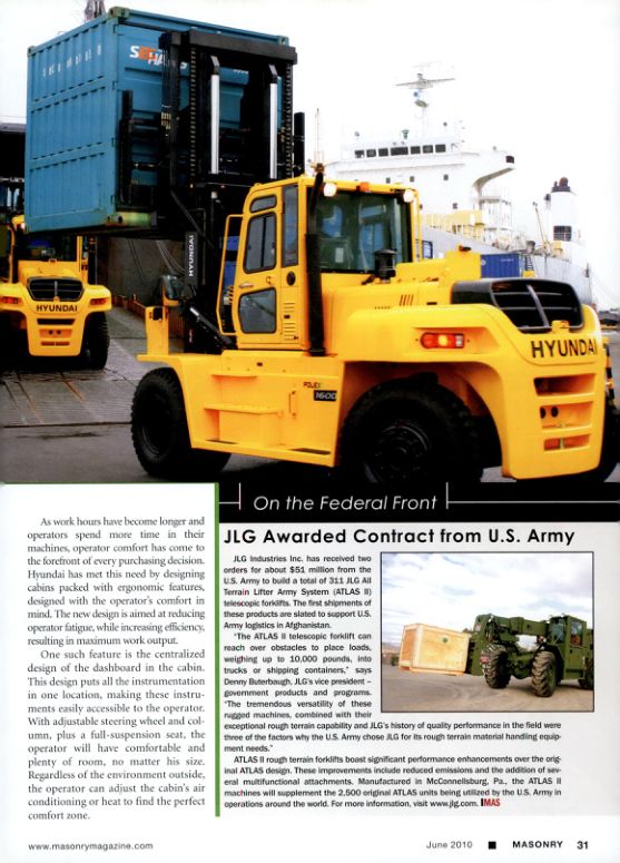 JLG Industries Inc. has received two orders for about $51 million from the U.S. Army to build a total of 311 JLG All Terrain Lifter Army System (ATLAS II) telescopic forklifts. The first shipments of these products are slated to support U.S. Army logistics in Afghanistan.