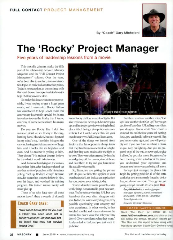 This month's column marks the fifth year of the relationship between Masonry Magazine and the "Full Contact Project Management" column. Over the years, we've been able to use fun, non-construction topics to make real construction points. Today is no exception, as we continue with this year's theme: how sports-related movies help PM lessons come alive.