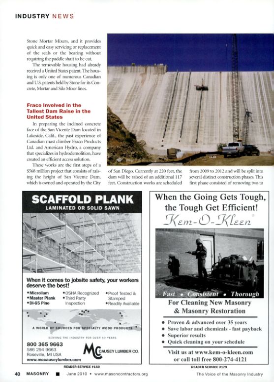 Fraco Involved in the Tallest Dam Raise in the United States. In preparing the inclined concrete face of the San Vicente Dam located in Lakeside, Calif., the past experience of Canadian mast climber Fraco Products Ltd. and American Hydro, a company that specializes in hydrodemolition, have created an efficient access solution. These works are the first steps of a $568 million project that consists of raising the height of San Vicente Dam, which is owned and operated by the City of San Diego. Currently at 220 feet, the dam will be raised of an additional 117 feet. Construction works are scheduled from 2009 to 2012 and will be split into several distinct construction phases. This first phase consisted of removing two to
