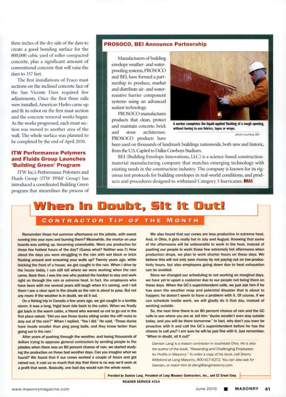 Remember those hot summer afternoons on the jobsite, with sweat running into your eyes and burning them? Meanwhile, the mortar on your boards was setting up, becoming unworkable. Were you productive for those few hottest hours of the day? (Guess what? Neither was I!) How about the days you were struggling in the rain with wet block or brick floating around and smearing your walls up? Twenty years ago, while bricking the front of a house, we got caught in the rain. When I drive by the house today, I can still tell where we were working when the rain came. Back then, I was the one who pushed the hardest to stay and work right on through the rain or extreme heat. In fact, the employees who have been with me several years still laugh when it's raining, and I tell them I see a clear spot in the clouds so the rain is about to pass. But not any more: If the weather is in doubt, we sit it out.
