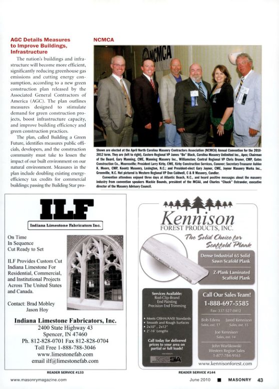 Shown are elected at the April North Carolina Masonry Contractors Association (NCMCA) Annual Convention for the 2010-2012 term. They are (left to right), Eastern Regional VP James "Bo" Black, Carolina Masonry Unlimited Inc., Apex Chairman of the Beard, Gary Manning, CME, Manning Masonry Inc., Williamston; Central Regional VP Chris Bruner, CMP, Gates Construction Co., Mooresville: President Larry Kirby, CME, Kirby Construction Services, Conover, Secretary-Treasurer Ashlee K. Moore, CMP, Koontz Masonry, Lexington, N.C.; and President-elect Gary Joyner, CME, Joyner Masonry Works Inc., Greenville, N.C. Not pictured is Western Regional VP Don Caldwell, C & R Masonry, Candler.