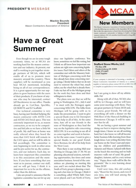 Even though we are in some tough economic times, we at MCAA are working hard for the mason contractors and our industry. At present, our staff is working to put together strategic partners of MCAA, which will enable all of us to promote more masonry around the country. These suppliers will be mentioned as you hear MCAA mentioned, including being on all of our correspondences. It is a great opportunity for our suppliers to grow business with the users of their products. If you know of anyone who may be interested, contact Jeff Buczkiewicz in our office. Thanks already go to CavClear, SpecMix, QUIKRETE and EZ Scaffold.