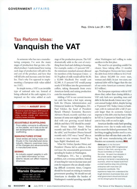 As someone who has run a manufacturing company, I've seen the many stages of production that go into a finished product. I understand how taxing each stage of production will add to the end cost of the product, and how that will kill jobs and increase costs for families. That's why I'm opposed to implementing a European-style value-added tax (VAT).