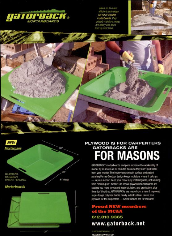 GATORBACK mortarboards and pans increase the workability of mortar by as much as 30 minutes because they don't pull water from your mortar. The impervious smooth surface and patent pending Perma-Contour design keeps moisture where it belongs -in your mortar! Keep your crew busy installing units, not wasting time "shaking up" mortar. Old school plywood mortarboards are costing you more in wasted material, labor, and production, plus they don't hold up. GATORBACKs are made from a new & improved super-tough polymer that is nearly indestructible. Leave your plywood for the carpenters - GATORBACKS are for masons!