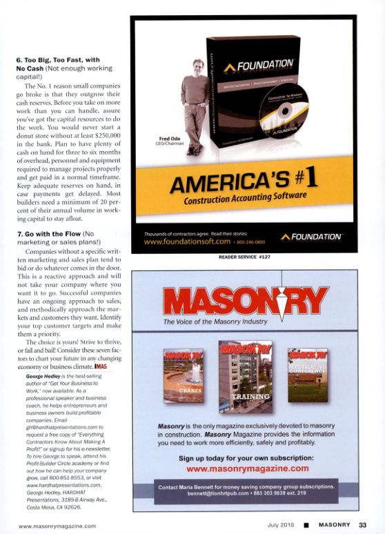 The choice is yours! Strive to thrive, or fail and bail! Consider these seven factors to chart your future in any changing economy or business climate. IMAS George Hedley is the best-selling author of "Get Your Business to Work," now available. As a professional speaker and business coach, he helps entrepreneurs and business owners build profitable companies. Email gh@hardhatpresentations.com to request a free copy of "Everything Contractors Know About Making A Profit!" or signup for his e-newsletter To hire George to speak, attend his Profit-Builder Circle academy or find out how he can help your company grow, call 800-851-8553, or visit www.hardhatpresentations.com. George Hedley, HARDHAT Presentations, 3189-8 Airway Ave., Costa Mesa, CA 92626 www.masonrymagazine.com Fred Ode CEO/Chaiman AFOUNDATION AMERICA'S #1 Construction Accounting Software Thousands of contractors agree. Read their stories www.foundationsoft.com 800-246-0800 READER SERVICE #127 AFOUNDATION MASONRY The Voice of the Masonry Industry CRANES TRAINING Masonry is the only magazine exclusively devoted to masonry in construction. Masonry Magazine provides the information you need to work more efficiently, safely and profitably. Sign up today for your own subscription: www.masonrymagazine.com Contact Maria Bennett for money saving company group subscriptions. bennett@lionhrtpub.com 883 303 5639 ext. 219 July 2010 MASONRY 33