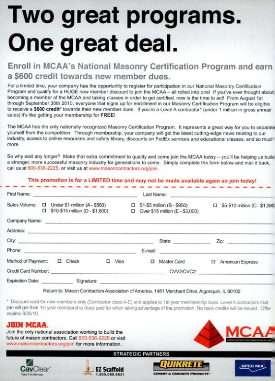 For a limited time, your company has the opportunity to register for participation in our National Masonry Certification Program and qualify for a HUGE new member discount to join the MCAA - all rolled into one! If you've ever thought about becoming a member of the MCAA and taking classes in order to get certified, now is the time to act! From August 1st through September 30th 2010, everyone that signs up for enrollment in our Masonry Certification Program will be eligible to receive a $600 credit" towards their new member dues. If you're a Level A contractor" (under 1 million in gross annual sales) it's like getting your membership for FREE!