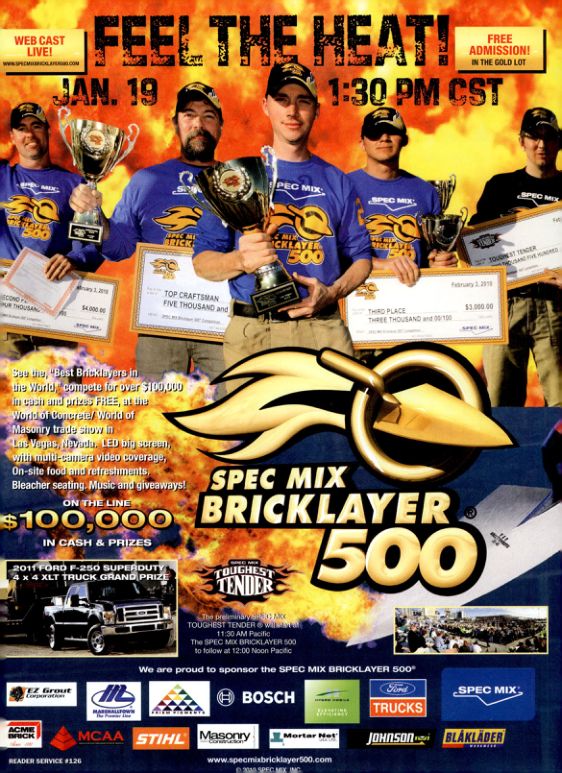 See the "Best Bricklayers in the World" compete for over $100,000 in cash and prizes FREE at the World of Concrete/ World of Masonry trade show in Las Vegas, Nevada. LED big screen, with multi-camera video coverage, On-site food and refreshments, Bleacher seating. Music and giveaways!