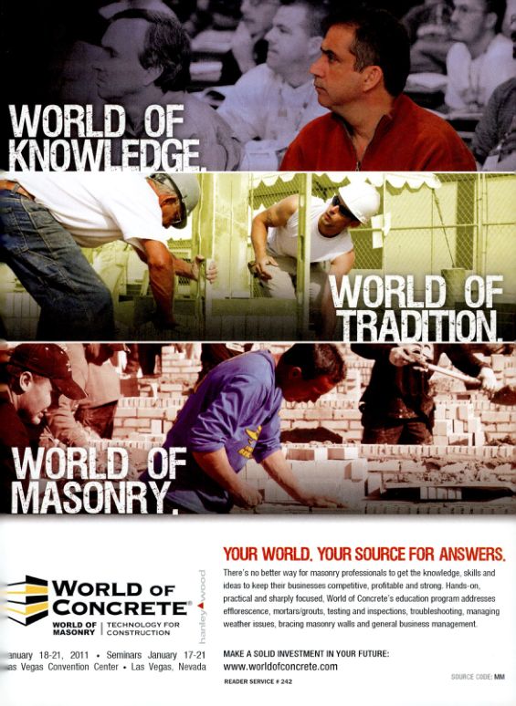 There's no better way for masonry professionals to get the knowledge, skills and ideas to keep their businesses competitive, profitable and strong. Hands-on, practical and sharply focused, World of Concrete's education program addresses efflorescence, mortars/grouts, testing and inspections, troubleshooting, managing weather issues, bracing masonry walls and general business management.