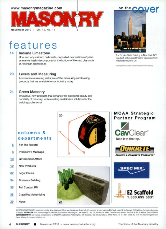 MASONRY (150025-4681) is published monthly Subscription rate 529 per year, Canada and Mexico $47 (US currency all other countries $ Single copies $8.50. Copyright 2000 by Mason Contractors Association of America. POSTMASTER: Send atness changes to MASONRY, Lionheart Publishing, Inc., 506 Roswell St., St. 220, Marietta, GA 30060, Canadian retum address Statice A, PO Box 54 Windsor, Ontario NSA 615