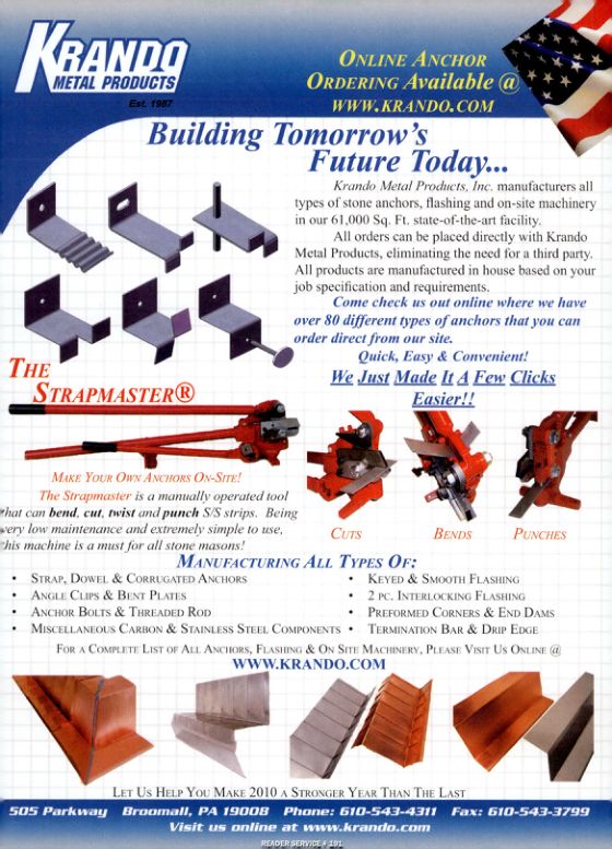 Krando Metal Products, Inc. manufacturers all types of stone anchors, flashing and on-site machinery in our 61,000 Sq. Ft. state-of-the-art facility.