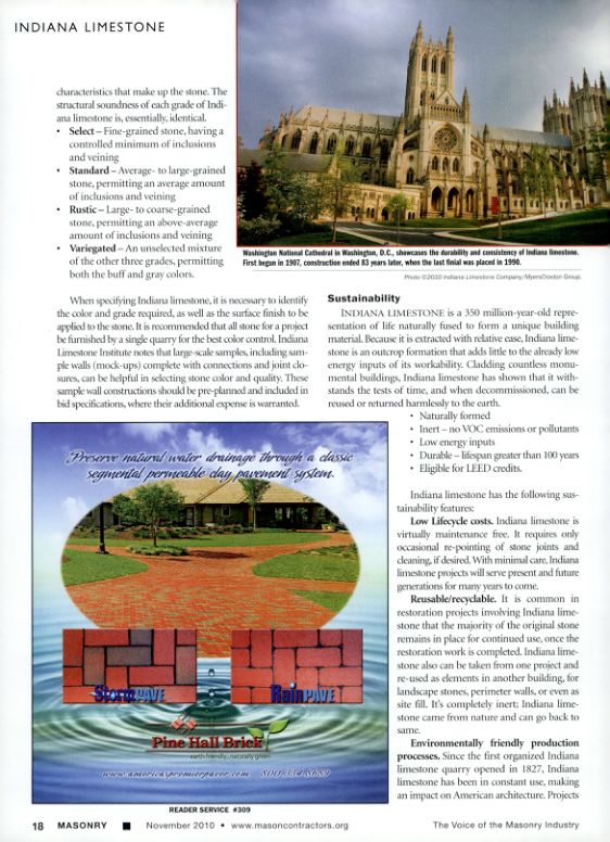 Low Lifecycle costs. Indiana limestone is virtually maintenance free. It requires only occasional re-pointing of stone joints and cleaning, if desired. With minimal care, Indiana limestone projects will serve present and future generations for many years to come.