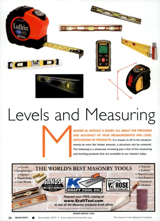 APPLICATION OF PRODUCTS. If a mason is off in his measurements by even the tiniest amount, a structure can be unsound. The following is a showcase reviewing just a few of the measuring and leveling products that are available to our industry today.