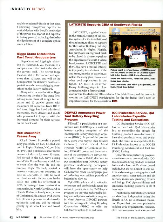 LATICRETE, a global leader in the manufacturing of innovative systems for the installation of tile and stone, to show its support for the Collier Building Industry Association in Naples, Florida, has purchased an engraved brick to be placed in the stone path to the organization's South Florida headquarters. LATICRETE and the CBIA have a mutual interest in top quality installations of tile and stone, interior or exterior, as well as the many glass mosaic and other pool applications in the region. LATICRETE co-owner Henry Rothberg stays in close connection with a former distributor in Tom Dardis from CBIA and now Affordable Floors, and the two set in motion the LATICRETE participation for the fundraiser that's been an important success for the association. IMAS