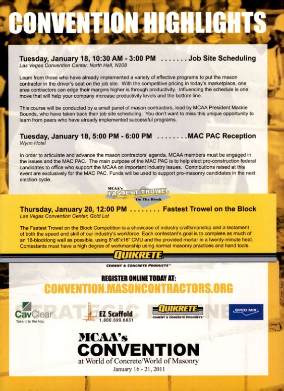 This course will be conducted by a small panel of mason contractors, lead by MCAA President Mackie Bounds, who have taken back their job site scheduling. You don't want to miss this unique opportunity to learn from peers who have already implemented successful programs.