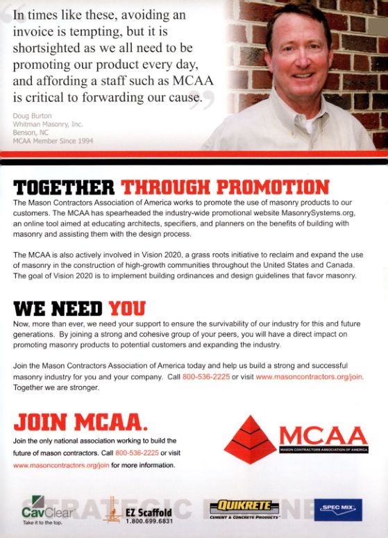 Join the Mason Contractors Association of America today and help us build a strong and successful masonry industry for you and your company. Call 800-536-2225 or visit www.masoncontractors.org/join. Together we are stronger.